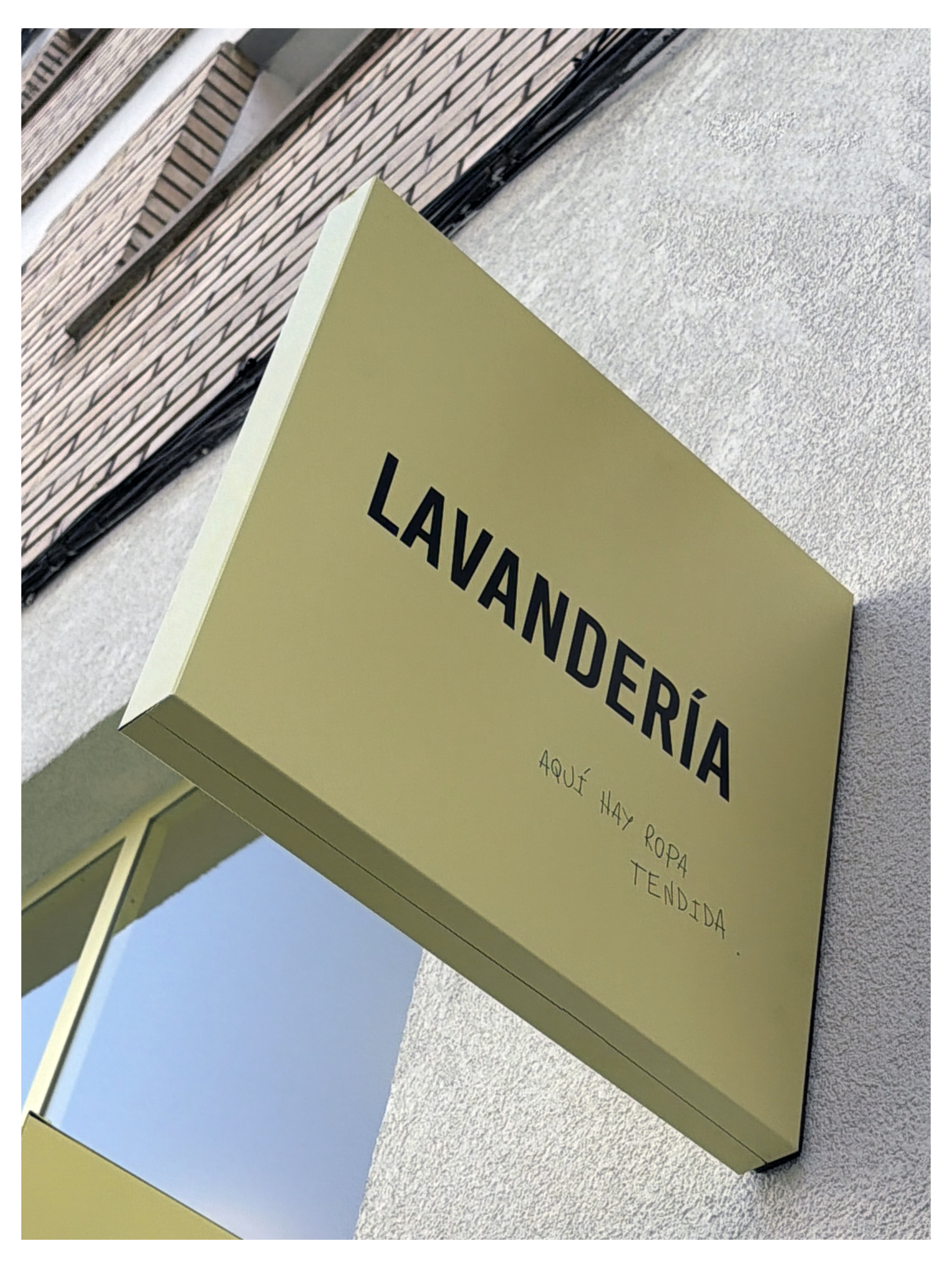 Aquí hay ropa tendida — handwritten on the external sign and the interior wall. Ironic, direct, memorable. It says everything without really saying anything. The tagline is not an afterthought: it is part of the visual architecture of the space, as considered as the choice of every material and fixture.