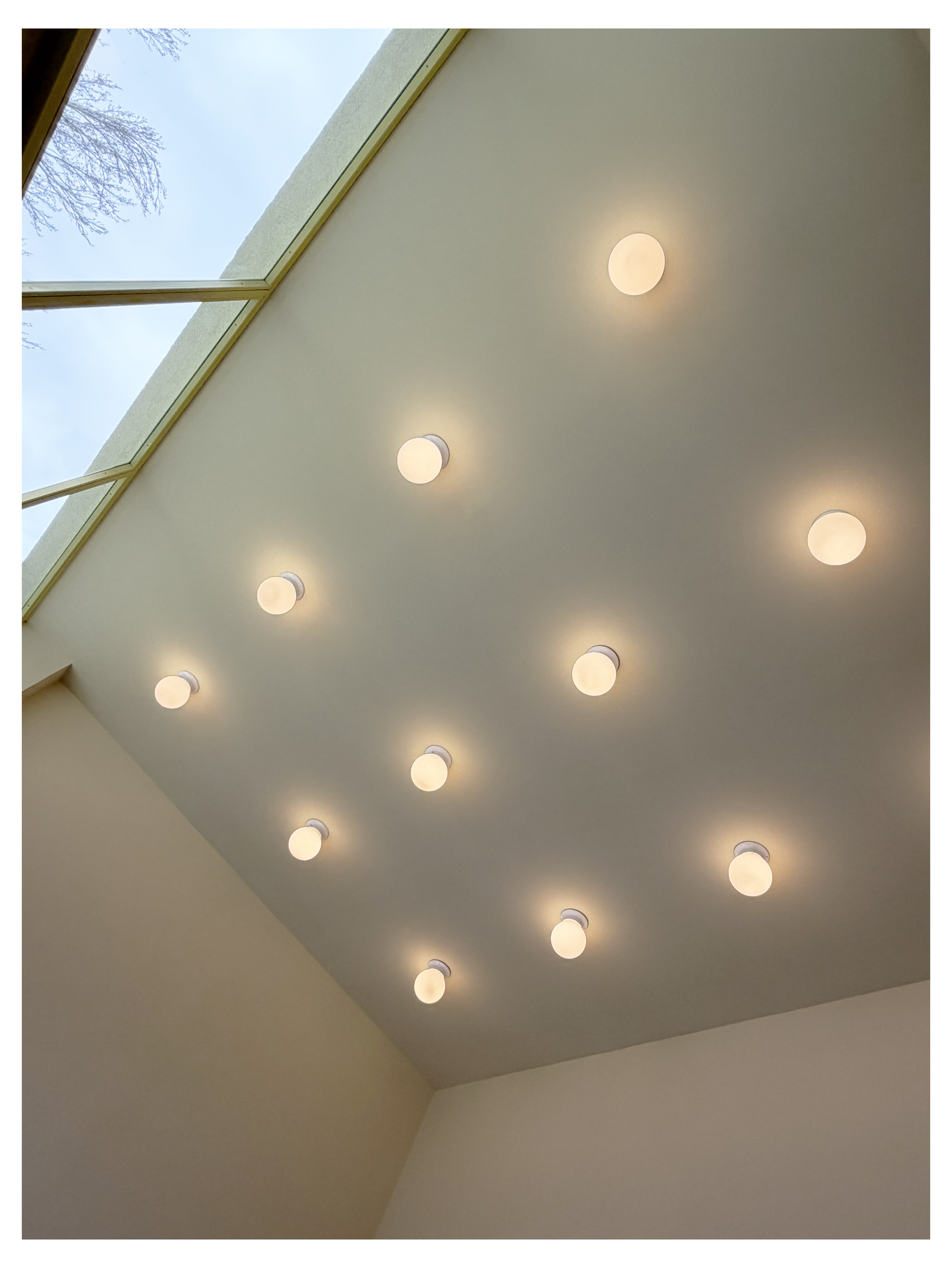 The yellow — bright, bold, almost pop — is not simply a facade colour. It is the first message to the passerby: something ordinary is done in an extraordinary way here. The globe lights punctuating the ceiling turn an everyday service into an almost domestic experience, warm and welcoming. Every design choice was made to make the space immediately recognisable from the street.