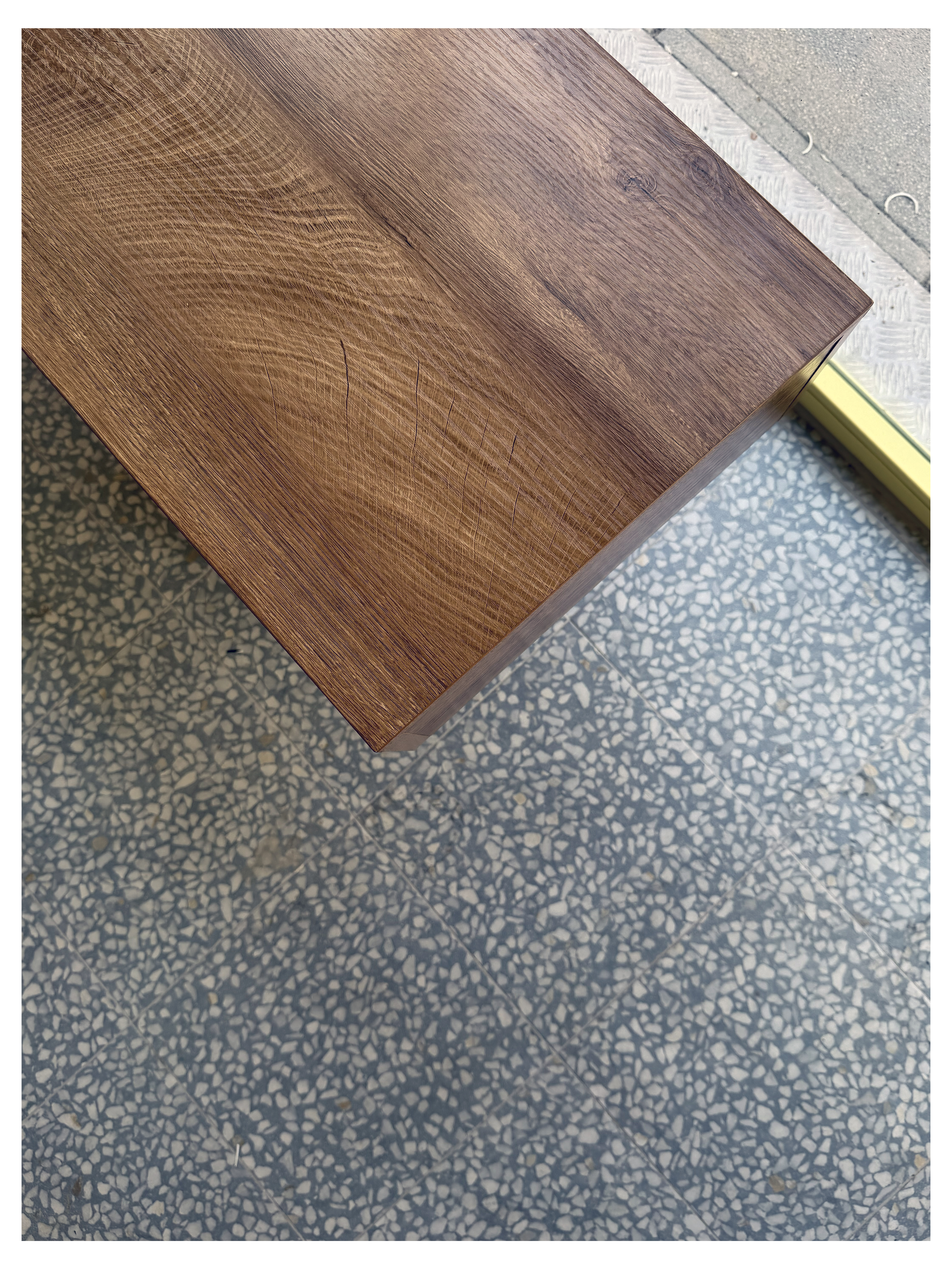 Oak wood and cement terrazzo flooring evoke a crafted aesthetic, far from the coldness typical of the sector. The brass counter completes the picture: quality in the details, even where you least expect it. The material palette was selected to create warmth and durability in equal measure — a space that looks good on day one and continues to age beautifully.