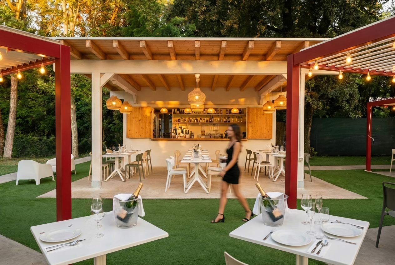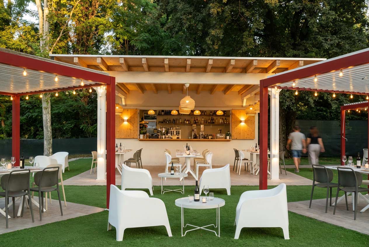 Davanti al chiosco si aprono diverse pergole in ferro con lamelle orientabili, dipinte in rosso coordinato che definiscono zone pranzo protette dal sole ma aperte sul paesaggio. La possibilità di regolare le lamelle permette di adattare l’ombreggiatura durante tutta la giornata, garantendo comfort sia a mezzogiorno che al tramonto.