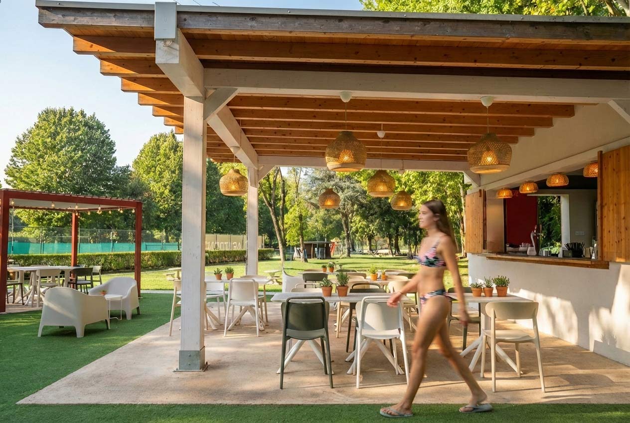 Il cuore del progetto è il chiosco bar-ristorante: una struttura di 50 mq in muratura e legno che ospita una cucina professionale completa. Non un semplice punto ristoro, ma un vero ristorante capace di servire pranzi e cene durante tutta la stagione.